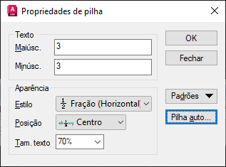 Especifica o formato do estilo para texto empilhado: fração horizontal, fração diagonal, tolerância e decimal.