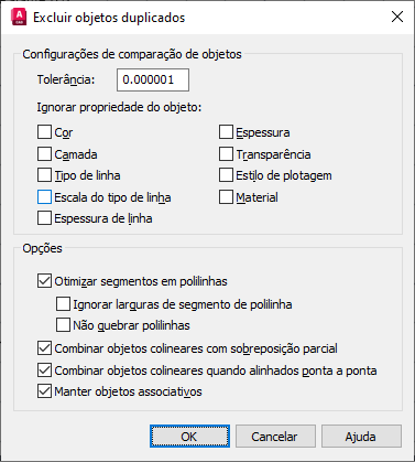 Quando selecionada, os segmentos individuais de linha ou arco das polilinhas selecionadas são examinados. Os vértices e segmentos duplicados são removidos.