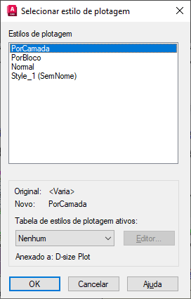 Exibe os estilos de plotagem disponíveis, incluindo o estilo de plotagem padrão, NORMAL. Um estilo de plotagem é um conjunto de configurações de propriedade utilizadas na plotagem.