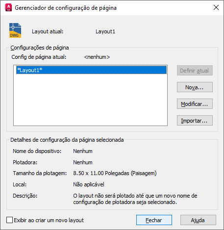 É possível criar também configurações de página nomeadas, modificar as existentes ou importar configurações de outros desenhos.