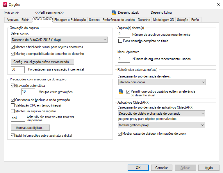 Minutes Between Saves: Quando Automatic Save estiver ativada, especifica a frequência de gravação do desenho. (variável de sistema SAVETIME)