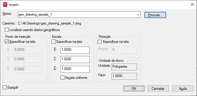 Explode o bloco e insere suas partes individuais. Quando Explode é selecionado, você pode especificar somente um fator de escala uniforme.