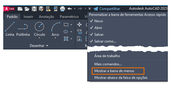 A barra de menus pode ser ativada a partir da barra de ferramentas Acesso rápido ou ao utilizar o menu suspenso IUP para personalizar a interface do usuário.