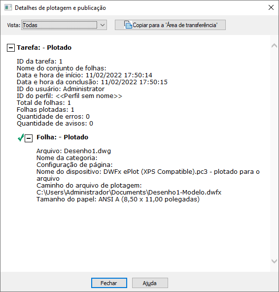 Exibe informações sobre trabalhos de plotagem e publicação que foram concluídos na sessão atual.