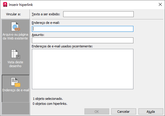 Relaciona os endereços de e-mail utilizados recentemente, que você pode selecionar para utilizar no hiperlink.