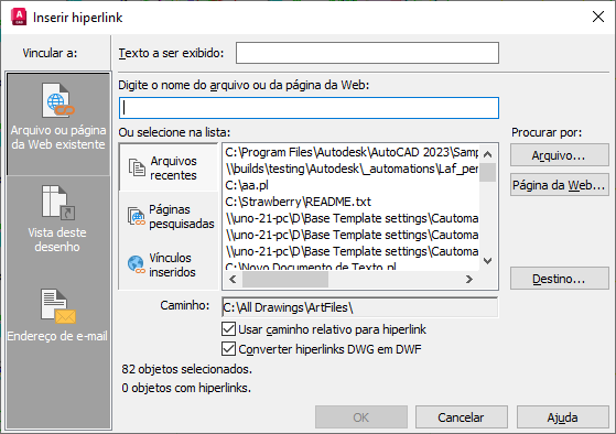 Exibe o caminho do arquivo associado ao hiperlink. Se a opção Use Relative Path for Hiperlink estiver selecionada, será exibido somente o nome do arquivo. Do contrário, o caminho completo e o nome do arquivo estarão relacionados.