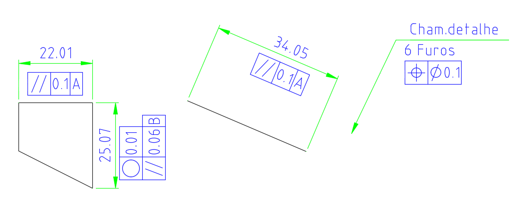 Você pode criar símbolos de tolerância geométrica associados ao texto de cotas, furos, notas de rosca e chamadas de detalhe. Os símbolos de tolerância geométrica também são posicionados de acordo com as normas internacionais de desenho.
