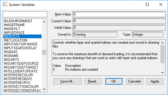 Entre mais de 500 variáveis de sistema que controlam o comportamento do AutoCAD, há diversas que você pode usar para melhorar o gerenciamento de grandes conjuntos de dados. Esta seção explica primeiro como acessar o Editor de variável de sistema e, a seguir, fornece informações de plano de fundo e ajustes recomendados para uma determinada variável.