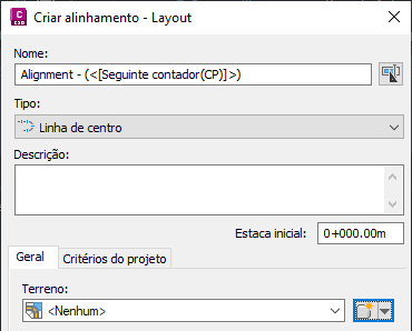 Quando você criar um alinhamento com as caixas de diálogo Criar alinhamento - Layout ou Criar alinhamento - pela polilinha, o padrão será criar o alinhamento com nenhum terreno especificado <Nenhum>, conforme mostrado na imagem 2.