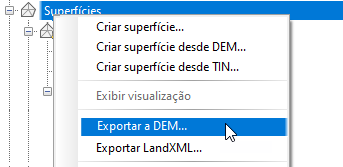 O Autodesk Civil 3D permite exportar arquivos DEM de uma superfície. Durante a exportação, é possível expandir o espaçamento da malha para criar o arquivo menor. A Figura 3 mostra a seleção do menu usado para iniciar o processo de exportação.