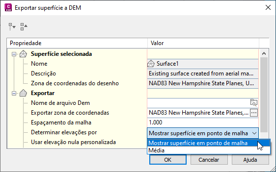 Uma configuração de exportação importante é o método para determinar a elevação em cada ponto. Você pode escolher experimentar a elevação da superfície no ponto da malha ou calcular a elevação média a partir dos pontos ao redor. O último método (média) é mais demorado. Para maior eficiência, utilize a opção de amostragem de superfície, como exibido na figura 4.