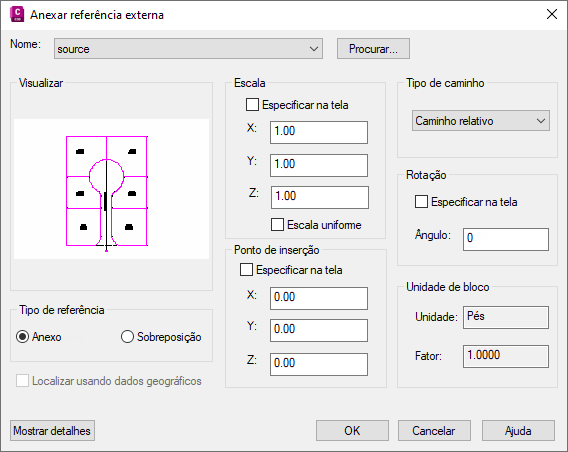 - Na caixa de diálogo Referência externa, defina o Ponto de inserção para 0,0,0, a escala para 1,1,1 e o ângulo de rotação para 0.