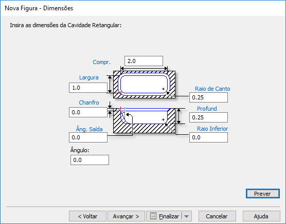 - Selecione Cavidade Retangular e clique em Avançar para exibir a página Nova Figura - Dimensões. Configure os seguintes atributos: