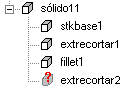 Se uma figura de modelagem em sólido torna-se desconectada do sólido, um ponto de interrogação é exibido sobre seu ícone na vista da peça como mostrado abaixo.