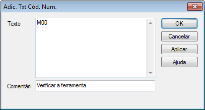 Esse diálogo permite inserir linhas únicas ou múltiplas de código numérico antes do ponto selecionado e opcionalmente adicionar um comentário.