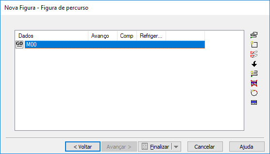 Nota: Caso você esteja criando o percurso a partir de movimentos inseridos manualmente ou a partir de uma curva, precisa selecionar manualmente ferramentas e valores de avanços e velocidades.