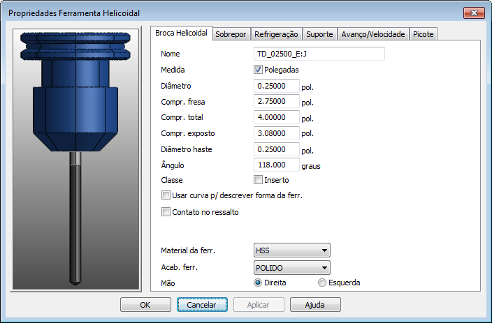 Acab. Ferr. — É o revestimento ou acabamento da ferramenta. Essa informação também é utilizada em cálculos de avanço/velocidade. Se uma tabela de avanço/velocidade existe para um material cortado com uma ferramenta com acabamento Polido, mas não para acabamento TI_N ou Black Oxide, então os valores de velocidade derivam da tabela Polido. A velocidade para TI_N é 1.5 vezes maior que a velocidade Polido. A velocidade para BLACK_OXIDE é 1.05 vezes maior que a velocidade POLIDO. Os avanços são os mesmos que os avanços Polido.