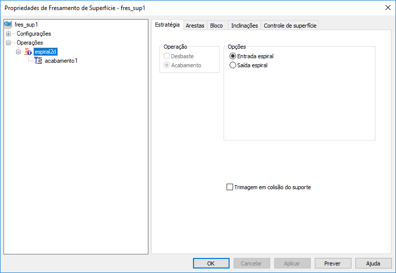 Trimagem em colisão do suporte — Trima o percurso onde o suporte ou haste colide com uma superfície da peça, superfície de controle ou material não usinado. Quando selecionado, os atributos Folga de suporte e Folga da haste são exibidos na guia Fresamento para a operação.