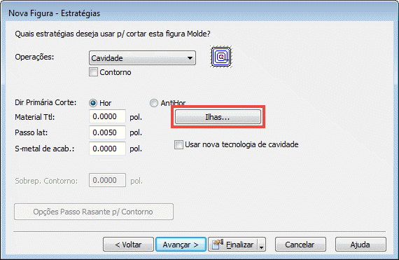 Quando você seleciona Cavidade ou Zigzag como a operação na página Estratégia do assistente de Nova Figura (ou a guia Estratégia do diálogo de Propriedades da figura), nota um botão rotulado Ilhas.