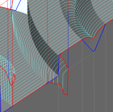 No exemplo a seguir, a fronteira da peça (vermelho) é suave, mas o offset da ferramenta (azul) é grosseiro. Diminua a Tol fronteira offset para um offset de ferramenta mais suave: