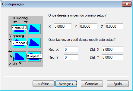 Dist. X e Dist. Y são os espaços entre origens de peça. Dependendo do seu processador, esses números de espaçamento podem não ter qualquer efeito na peça quando produzida na máquina. Isso é controlado pelo ID de Fixação e como o ID de Fixação é usado para posicionar outras peças com relação umas às outras.