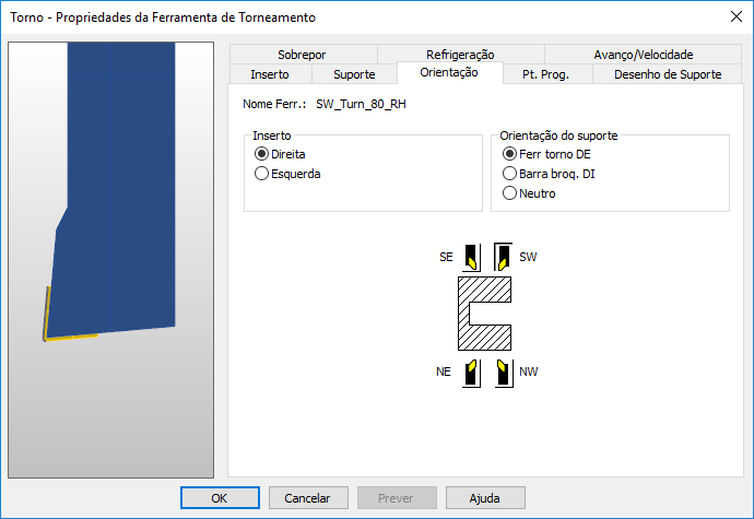 Na guia Orientação, é possível configurar a orientação do suporte na máquina e a mão da ferramenta.