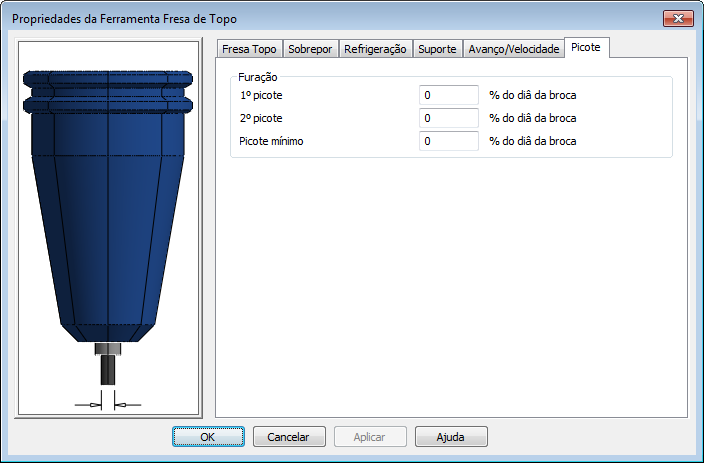 Por exemplo, se o diâmetro da ferramenta for 1", e a profundidade de 1º picote da ferramenta for 80% do diâmetro da ferramenta, a profundidade de 1º picote da operação é 0.8", independente da profundidade de 1º picote global especificada no diálogo Atributos de Usinagem.