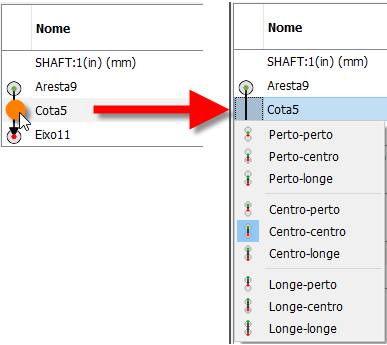 Quando o recurso acima e abaixo da cota é um recurso de tamanho, existem várias opções. A primeira indica se a origem de cota deve ser anexada ao lado Próximo, Centro ou Afastado do recurso imediatamente acima da cota. O segundo item se aplica ao anexo ao recurso imediatamente abaixo da cota. Se somente um dos recursos for uma operação de tamanho, haverá somente três opções na lista.
