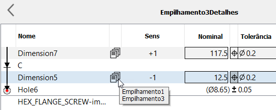 Após você ter concluído a definição do contorno da peça, o Tolerance Analysis exibirá as cotas entre os recursos selecionados nas peças e criará a tabela de análise de pilha preliminar no painel Detalhes de pilha.