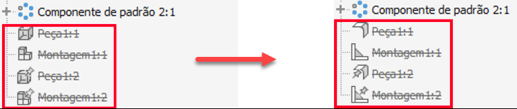 No navegador de montagem, os ícones referentes a peças suprimidas de chapa de metal e conjunto soldado foram atualizados para refletir a aparência dos ícones de peças não suprimidas. Os ícones antigos de chapa de metal e conjunto soldado desativados não serão atualizados até que você os reative e, a seguir, desative-os novamente.