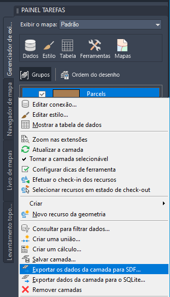 - No Gerenciador de visualização, clique com o botão direito do mouse na camada de Lotes e clique em Exportar dados de camada para SDF.