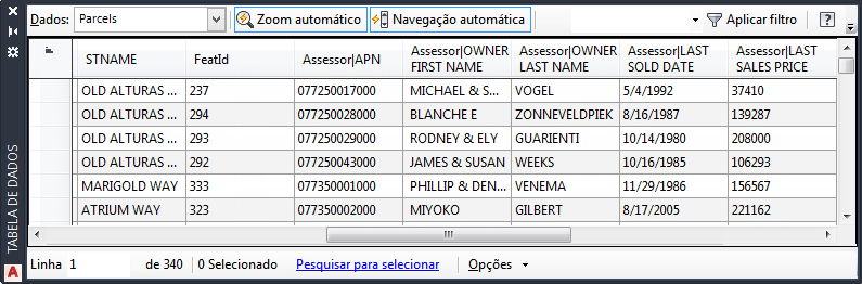 A camada de Lotes agora exibe dados unidos. No entanto, os dados unidos na Tabela de dados estão cinza. O texto cinza reflete o fato de que os dados unidos não são parte do armazenamento de dados original. Não é possível editar ou utilizar uma propriedade calculada.