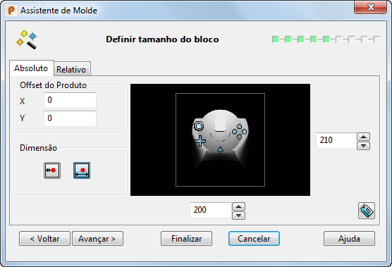 Um bloco é criado automaticamente em torno do objeto selecionado, a menos que você tenha acessado o Assistente de Molde com um bloco já definido. Para especificar o tamanho do bloco, você pode utilizar valores absolutos ou relativos. O assistente mostra uma imagem da peça sombreada e do bloco em modelo de arames. Você também pode rotacionar, aproximar, afastar e arrastar essa imagem utilizando o mouse.