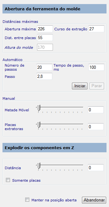 Abertura manual — Configura as distâncias para a abertura manual da ferramenta de molde: