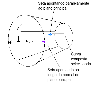 Considere a seguinte curva composta sobre uma superfície. Com Normal ao plano principal selecionado (por padrão) nas opções em Medir ângulo a partir de, as setas apontam conforme mostrado abaixo.