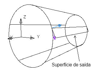 Se você estiver criando uma superfície de saída a partir de superfícies ou sólidos, uma seta é projetada das superfícies. Ela é paralela ao eixo normal ao plano principal e é utilizada para calcular onde as curvas de saída posicionam-se nas superfícies.