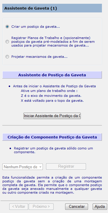 - Clique em Assistente > painel Criar Moldes > Gaveta para exibir o Assistente de Gaveta:
