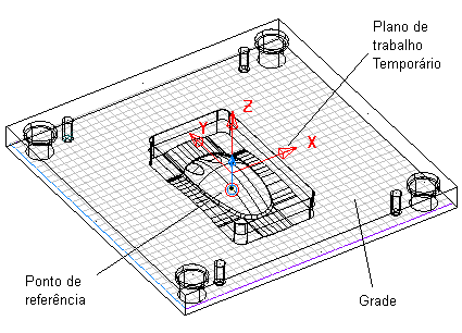 Uma grade é desenhada e ajustada dentro das placas do molde representando o plano em que os furos serão posicionados. Um plano de trabalho temporário é criado no centro da caixa limitante em torno das placas do molde para proporcionar uma origem local a partir da qual os furos são criados. Um ponto de referência também é desenhado. Por padrão, ele toca o plano inferior da caixa limitante em torno da placa do molde e está diretamente abaixo da origem do plano de trabalho temporário.