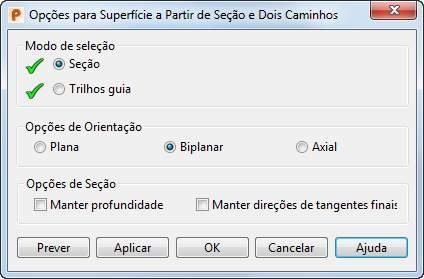 Se você clicar em Avançado no diálogo Criador de Superfície ao criar uma superfície usando a opção Dois caminhos, o diálogoOpções da Superfície a partir de seção e dois caminhos será exibido. Utilize essa caixa de diálogo para especificar as opções de criação avançada.