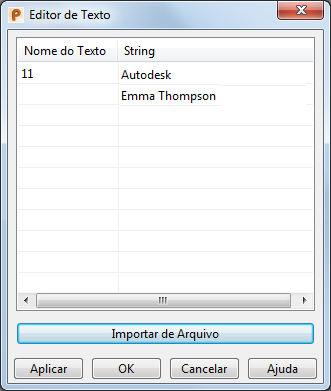 Modificar Texto — Selecione essa opção para exibir o diálogo Editor de Texto. O diálogo contém os nomes e sequências de texto incluídos no desenho.