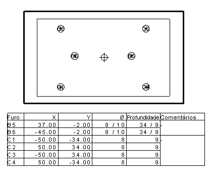 A legenda exibe os rótulos, centros, diâmetros e profundidades dos furos. Se um furo é cônico, apresenta dois diâmetros.