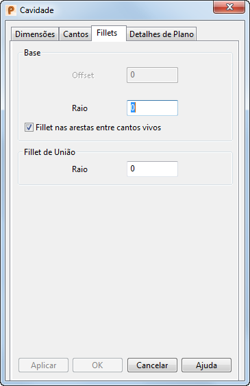 A guia Fillets permite definir o fillet que segue ao longo da base da cavidade ou do topo da protrusão.