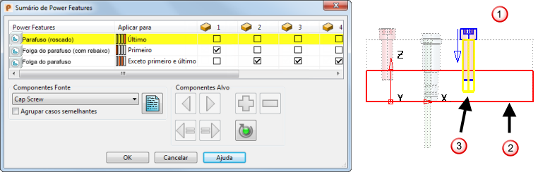 No exemplo a seguir, a primeira linha é selecionada; isso representa o furo roscado da Power Feature. A regra da Power Feature que exibe essa figura é Aplicada à Última Interseção somente, e o destaque no modelo reflete isso: