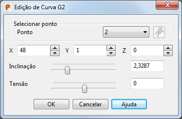 Utilize o diálogo Edição de Curva G2 para editar a forma de uma curva G2.