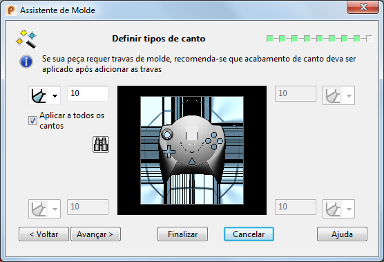 Nota: Quando você seleciona Próximo ou Finalizar, o assistente irá prosseguir somente se as configurações de acabamento de canto não causarem problema. Se as configurações causarem problemas (por exemplo, o produto sai do bloco), o assistente irá exibir o diálogo Erro e permanecerá na página atual de forma que você possa encontrar o problema e ajustar o tipo de canto ou valor de acordo.