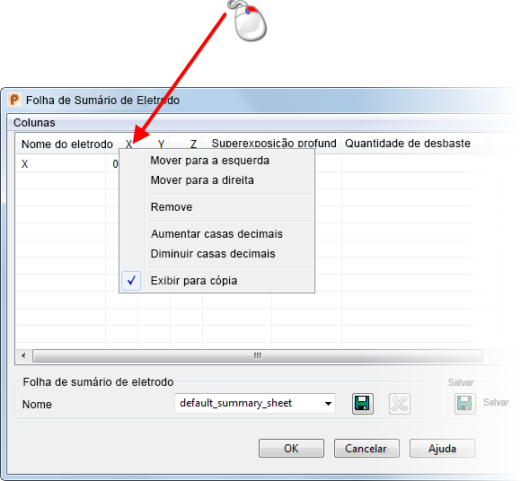 - Clique com o botão direito nos cabeçalhos de coluna no diálogo Folha de Sumário de Eletrodo e utilize as opções dos menus de contexto para personalizar o layout da folha de sumário.