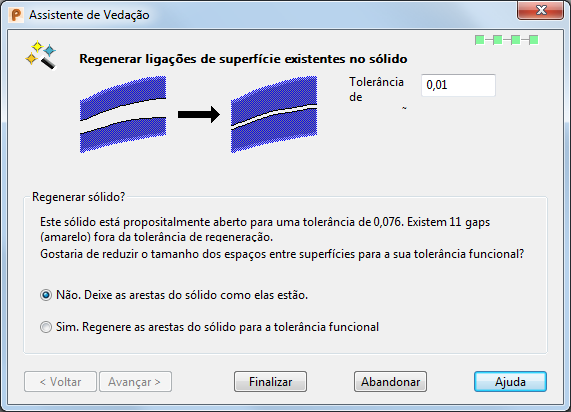 Finalizar — Realiza a operação de regeneração selecionada. Se o processo de regeneração for incapaz de regenerar para a tolerância especificada, uma mensagem de aviso é exibida.