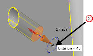 A direção do movimento é alinhada à normal da geometria naquele ponto. A instrumentação gráfica indica a direção de movimento.