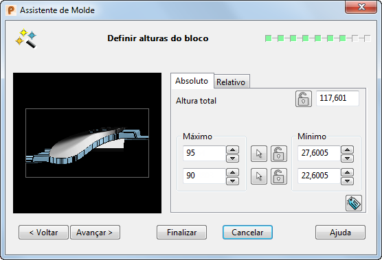 A espessura mínima dos dois insertos do molde é calculada automaticamente e os valores são exibidos no assistente, mas você também pode definir a altura do bloco utilizando esta opção. O valor superior representa a altura mínima da cavidade. O valor inferior é a altura mínima do macho.
