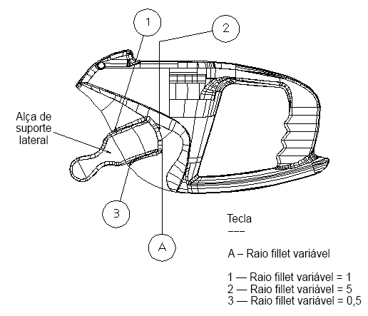O seguinte exemplo apresenta uma superfície de fillet na alça suporte na lateral.
